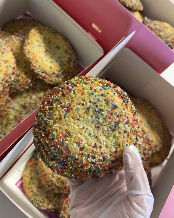 Box of 12 small-medium sugar cookies covered in sprinkles!